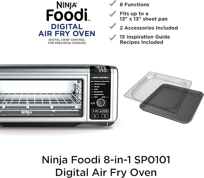 The Ninja SP101 Digital Air Fry Countertop Oven is a versatile 8-in-1 appliance that combines air frying, toasting, roasting, and more in one compact unit. Designed to save counter space, it flips up and away for storage when not in use. With convection cooking and digital controls, it delivers fast, even results for healthier meals. Ideal for busy kitchens, this oven brings convenience, efficiency, and versatility to everyday cooking.