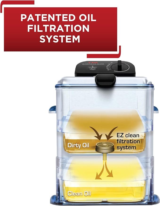 Enjoy professional frying at home with the T-fal Ultimate EZ Clean Deep Fryer. Its advanced oil filtration system keeps your oil clean for reuse, while the stainless steel design ensures durability and sleek style. Perfect for crispy fries, chicken, and more — it’s easy to clean, efficient, and built for everyday cooking.